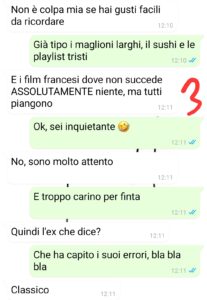 Ha iniziato a scrivermi il buongiorno, a ricordarsi le date, a portarmi i miei biscotti preferiti. Si è persino messo a guardare le mie serie per poterne parlare con me. E durante la “recita”, quando dovevamo far finta di baciarci per una foto, non so chi dei due ha chiuso gli occhi prima. Ora il mio ex vuole tornare quindi obbiettivo raggiunto, in parte. Ma io non so più se mi manchi lui, o se in realtà l’unico che mi manca è Matteo, anche se è sempre stato qui e io come la scema non me ne sono mai accorta. Ecco, aiutatemi: come si fa a distinguere un gioco da un sentimento vero?”