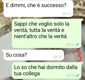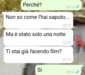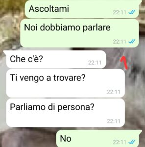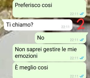 “A volte si fanno errori pensando che sia come ce la immaginiamo la cosa, ma i nostri sentimenti ci muovono in certe decisioni e io della mia non me ne sono pentita. Però ci penso e ripenso se si sarebbe potuto evitare, se poteva cambiare qualcosa, ma ormai il dado era tratto come si suol dire e con lui ho avuto una conversazione strana che mi ha fatto capire tutto il mistero che ci fosse dietro. Quindi mi chiedo se avessi saputo sarebbe cambiato qualcosa? Voi che avreste fatto al posto mio, vi mostro la chat di come a volte le scelte fanno pesare tutto e ci portano nel caso anche a sbagliare”
