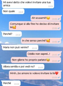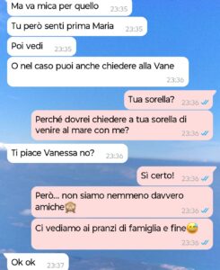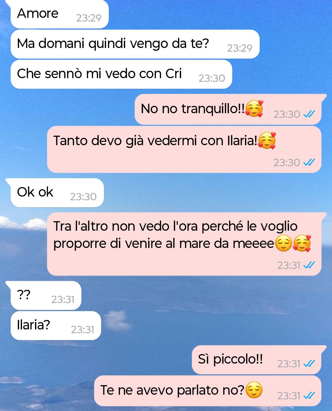 Tutto nasce da un messaggio assolutamente innocente: gli scrivo per dirgli che domani mi vedrò con Ilaria, una delle mie migliori amiche, e che ne approfitterò per invitarla a passare qualche giorno al mare da me quest’estate. Premessa: quella stessa settimana lui sarebbe andato a Maiorca con gli amici, quel tipo di amici che non vorresti per il tuo ragazzo e soprattutto con cui non vorresti che il tuo ragazzo andasse in vacanza, ma alla fine poi ci pensi, sai che ti fidi di lui e ingoi il rospo. Se in una relazione non c’è fiducia… non c’è relazione, no?