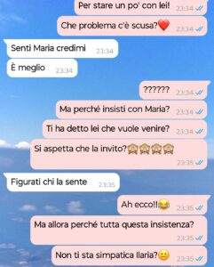 Che succede? Che comincia a chiedermi, prima con leggerezza, poi con insistenza, di invitare un’altra amica. Maria magari. Anche se non gli importa davvero chi, solo che non sia Ilaria. Mi propone persino di invitare sua sorella! Quando riesco a cavargli di bocca il perché, vedo rosso.