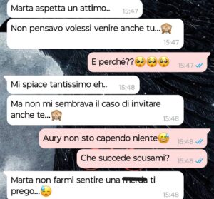 Aurora all’inizio era strana, evasiva. Poi, piano piano, mi ha detto che “non le sembrava il caso” di invitarmi. Io pensavo scherzasse. Lei invece pensava stessi scherzando io…!