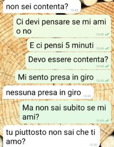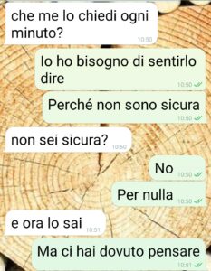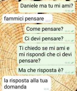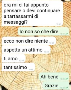 “Io sono Marina e vorrei una mano per questa chat in cui parlo con Daniele. Mi serve davvero perché mi ha lasciata rimbambita e anche adesso dopo due giorni non riesco a darle un senso. Non sono nemmeno riuscita a riprendere l’argomento con Daniele. E ci siamo visti regolarmente ieri e anche oggi. Per lui è come niente fosse accaduto, tutto normale. E io che non so come riaprire la cosa e lui che non si accorge che comunque sono strana, silenziosa, titubante. Boh. Cioè voglio dire c’è una fidanzata che si è sentita dire, dopo 4 anni di relazione eh, non un mese di frequentazione, FAMMICI PENSARE se ti amo? Che poi in qualche modo lo avevamo pure risolto, cioè mi ero convinta davvero di quello che mi ha detto. Ma poi? Amore di qua, amore di là, e pensa e pensa e mi dà questo manrovescio senza preavviso? Perché non ci rifletto? Ma saprò quello che voglio o no? Anche se adesso…”