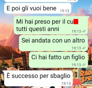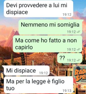 non voglio più stare con mia moglie e non voglio più essere padre perché padre effettivamente non lo sono. Voglio disconoscere il bambino!!! Non voglio lasciare le mie cose a lui!! Non voglio più pagare per lui ca**!!