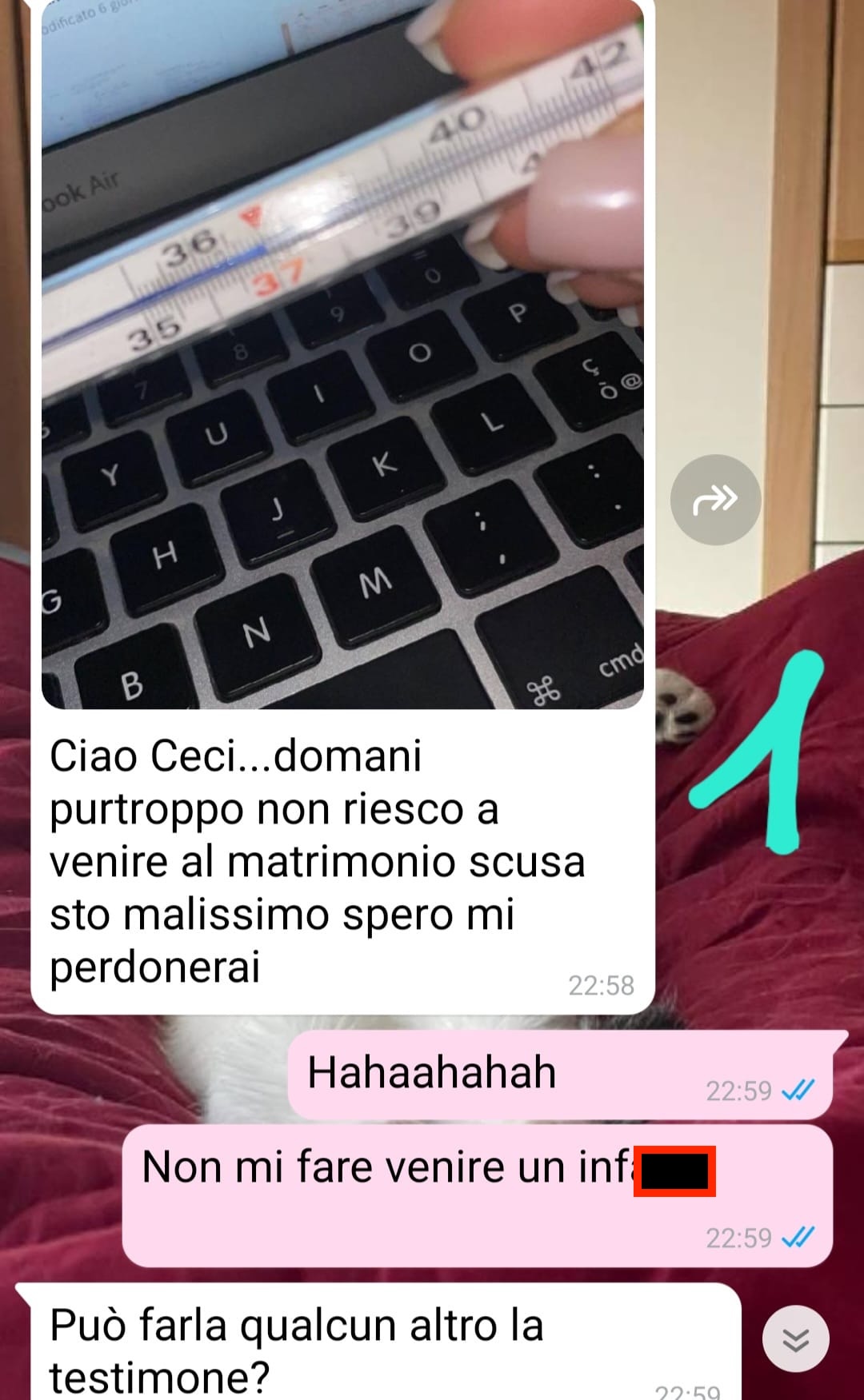 “Io mi chiamo Cecilia e tre giorni fa mi sono sposata con l’amore della mia vita. E’ stata una giornata stupenda che ricorderò per sempre perché c’erano tutte le persone che amo…o meglio, quasi tutte. La sera prima della cerimonia, infatti, mentre ero a letto, piena di ansia e di emozione per quello che sarebbe successo il giorno dopo, la mia migliore amica, nonché testimone di nozze, mi ha mandato una foto: un termometro.