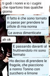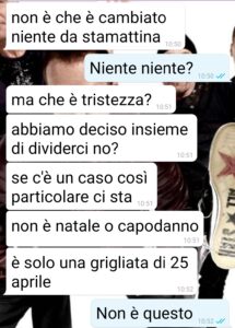 “Ciao pagina di spunte blu, io sono Lorenzo e vi sottopongo questi screen del 25 aprile, festa della liberazione d’Italia. Ovviamente è il classico giorno di grigliata, amici o famiglia poco importa, basta che ci sia abboffata di carne. Con la mia fidanzata, Miriam, quest’anno abbiamo deciso di passare questa giornata separati. Oddio, veramente lo ha deciso lei, ma tutto sommato le motivazioni erano valide. Lei aveva degli zii e dei cugini da fuori che presto sarebbero ripartiti. L’unica occasione di stare con loro. Io i miei nonni tutti assieme dopo un po’ di anni (e non so quante altre occasioni ci saranno…). Tutto bene dunque, tutti contenti. Peccato solo che dal fruttivendolo incontro il padre di Miriam. Tra un augurio e una mezza cazziata capisco che pensa che la figlia sia con me. Qualcosa non torna. Scrivo alla mia dolce metà. Per scoprire che…”