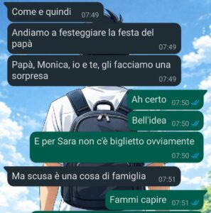 “Questa settimana c’è la festa del papà. È una festa che non mi piace perché mi ricordo ogni volta che razza di padre ho avuto io. Il mio non è stato un buon padre, e lo so che tutti i figli hanno qualche peccato di cui accusare i padri. E ce ne sono sicuramente di peggiori del mio, non è una gara ragazzi. Però non mi chiedete di festeggiarla perché ho dovuto raccogliere io i cocci di mia madre quando lui se n’è andato. Ha scoperto di essere giovane di nuovo quando avevo diciotto anni. Ho dovuto abbandonare tutto per aiutare in casa, la casa da cui se n’è andato. E per di più non vede di buon occhio Sara, la mia fidanzata che invece mi ha fatto capire che io non sono come lui. E poi c’è Marina, mia sorella. Lei bacia la terra su cui cammina nostro padre, lo aiuta nel negozio di cui è tanto orgoglioso, crede che sia la persona più intelligente del pianeta. Vive con lui, lavora con lui, lo segue in ogni cosa. E come lui, fa finta che la mia storia con Sara sia passeggera e non perde occasione di ricordarmi che casa mia dovrebbe essere lì, con loro.”