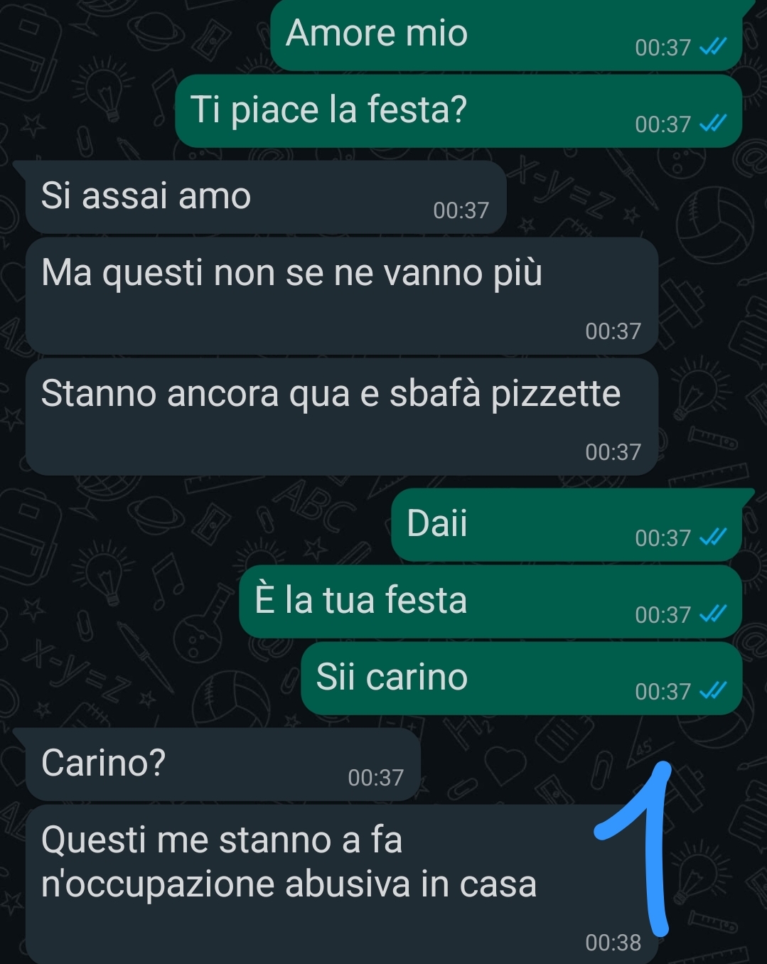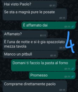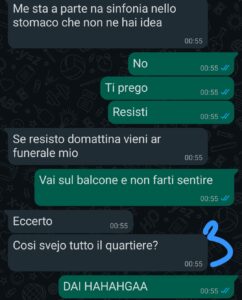 In mezzo a questo delirio ci scrivevamo di nascosto, io che cercavo di calmarlo con qualche malizia, lui che minacciava di buttare tutti dal balcone. Sembrava già abbastanza, e invece no: la perla della serata è arrivata quando una delle invitate, un po’ brilla, ha confessato davanti a tutti di aver tradito il suo ragazzo… raccontando pure dettagli che nessuno avrebbe voluto sentire.