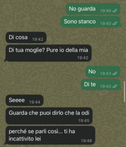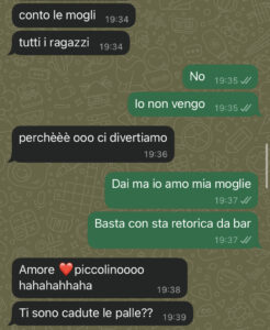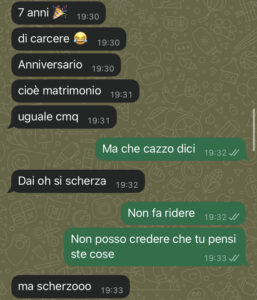 Vi devo dire non l’ha presa per niente bene, quindi io voglio mettere il suo gesto in pubblica piazza e gli farò leggere i commenti perché si deve vergognare di quello che ha anche solo pensato. Vi lascio gli screen della nostra chat.
