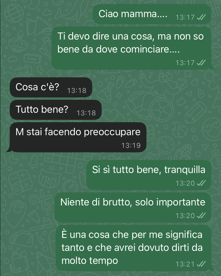 Non so nemmeno da dove cominciare… Ho solo bisogno di sentirmi meno solo. Ho fatto una confessione a mia madre, ho dovuto farlo, anche se forse non ero pronto. Ma ho dovuto perché dovevo anche chiederle una cosa importantissima, che per me ha un enorme valore affettivo ed emotivo, soprattutto dato che mio papà non c’è più. È morto cinque anni fa a causa di una brutta malattia ed era la mia roccia… Anche se è volato in cielo senza mai sapere la verità, forse in cuor suo lo sapeva e avrebbe accettato la mia richiesta. Invece mia madre… beh non è la classica madre amorevole, devo ammetterlo.