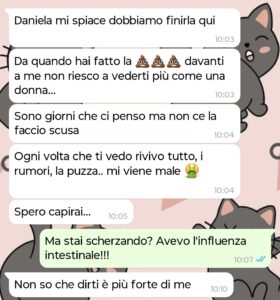 “Ciao a tutti, mi chiamo Daniela e il mio ragazzo mi ha lasciata perché sono stata male davanti a lui. E no, non siamo più bambini da un pezzo.