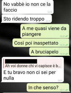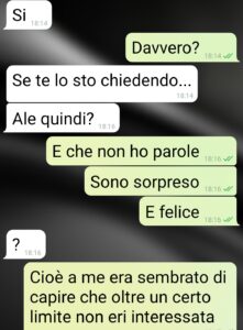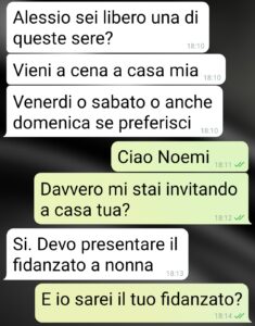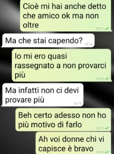 A me è successo in questa chat con Noemi. Ci conosciamo da 5 anni ormai e io ci ho provato all’inizio. E lei quando ha capito mi ha subito messo le cose in chiaro. Non è stata ambigua o altro. Amicizia si, oltre no. E io sono stato un amico da allora. Davvero non ho mai avuto altri intenti dopo quei primi mesi. E ora mi sento umiliato e anche un pezzo di merda. Capirete di cosa parlo leggendo la chat. La mia è stata una reazione di pancia, non mi interessa che ci faccio la figura del cretino. E comunque rimango convinto che anche lei poteva essere più chiara nella sua richiesta. Mi sento un po’ preso in giro ma comunque capisco anche che dal suo punto di vista ha ragione a sentirsi tradita. Dovremo chiarire. Voleva infatti solo un fidanzato per finta. E adesso non so che fare. Devo o non devo fare questa farsa? Il motivo è nobile o è una bastardata? Glielo devo o no? Consigliatemi”