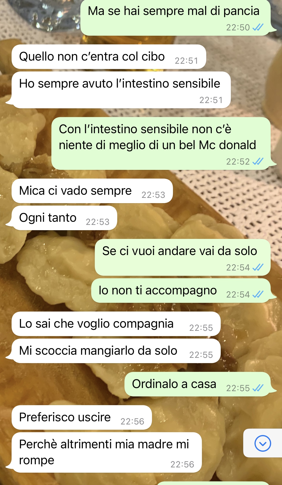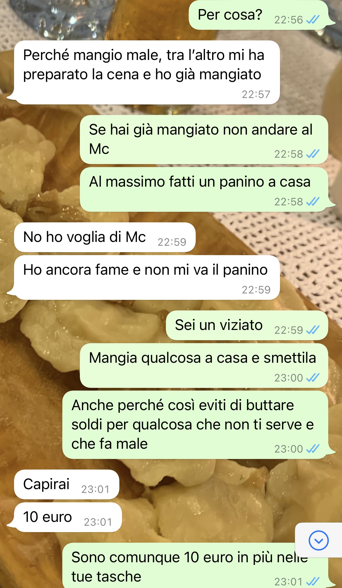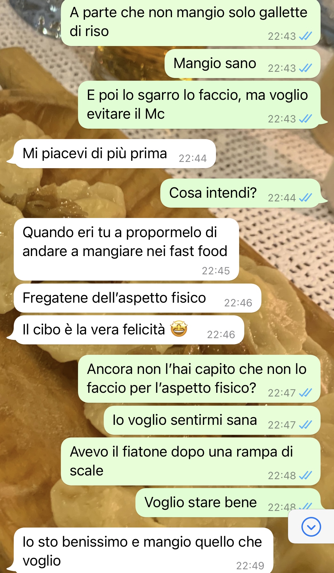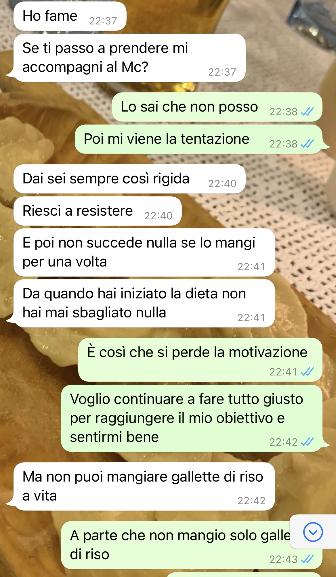 Da quando ho iniziato questo percorso ho perso 5 chili e ora me ne mancano 17 per raggiungere il mio obiettivo. Tutto va benissimo, eccetto per il mio ragazzo Edoardo… Lui ha la fortuna di poter mangiare ciò che vuole senza ingrassare di un solo grammo, anche se sto cercando di fargli capire che dovrebbe cercare di mangiare più sano anche lui perché il peso non è il solo problema. Non capisce la mia situazione e quanto è difficile per me, non mi aiuta per niente perché cerca di spingermi a mangiare tutto ciò che la dieta mi impone di eliminare.”