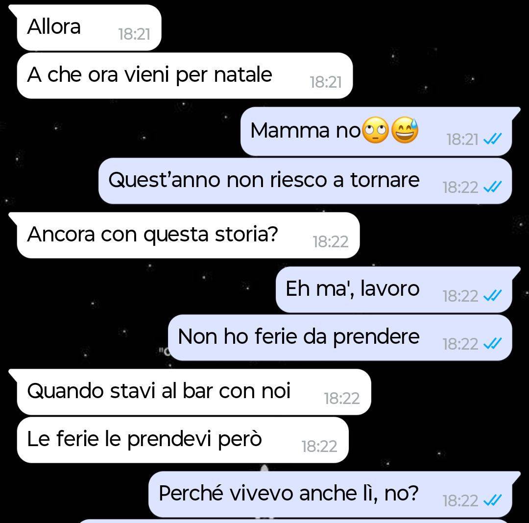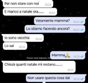 Fin da quando ero ragazzino, mi ha fatto sentire in colpa per qualsiasi scelta che non coincidesse con quello che voleva lei. Ogni decisione diventava un tradimento, ogni distanza un abbandono. Per anni ho lavorato nel bar di famiglia, rinunciando a tutto pur di non farla soffrire. Quando ho deciso di andare via per costruirmi una vita mia, non l’ha mai accettato davvero. Da allora ogni Natale è diventato un campo di battaglia: frasi dette a metà, vittimismo, allusioni sul tempo che passa e su quanti Natali “le restano”. Ho già perso una relazione importante per questo. Lei si sentiva soffocata, sempre messa in secondo piano da una madre che pretendeva di venire prima di tutto. Ora frequento una persona da due anni e non l’ho mai detto a casa. Proprio per paura. Questa chat è nata perché non potevo tornare a Natale. È finita mettendo nero su bianco il motivo per cui, forse, me ne sono andato davvero.”