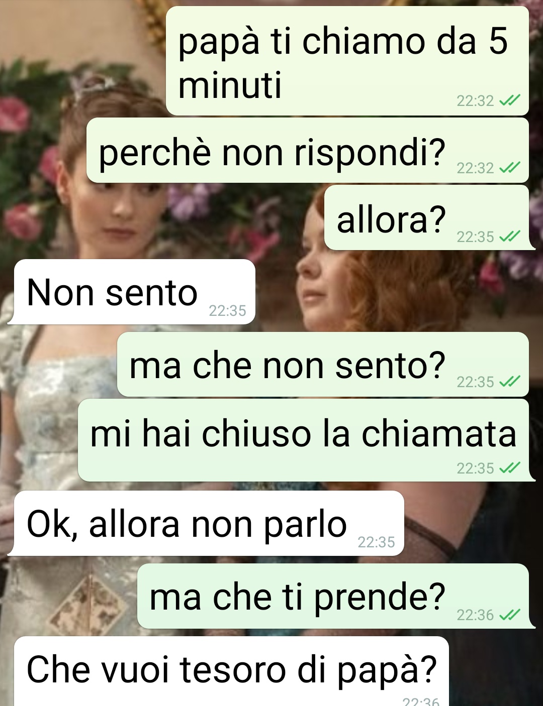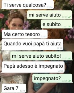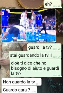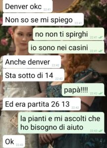 “Io non ci posso credere di avere un padre così strafottente nei confronti di una figlia. Io voglio che tutti i lettori di spunte blu leggano questa chat tra me mio padre. Vediamo se qualcun altro ha mai fatto una cosa del genere. Qua io sto parlando che un genitore di anni 58 mette davanti alla figlia una stupidissima partita di pallacanestro. Perché un conto è avere una passione, diverso è fregarsene del resto del mondo per quella passione. Perché se ti chiamo che ho bisogno di aiuto significa che ho bisogno di aiuto. Io non sono una di quelle figlie che rompono sempre ai genitori o sono viziate. E non sono nemmeno una adolescente che si caccia nei guai. E se ti chiedo aiuto, che sono nei guai e che è una cosa seria ca**o tu come padre devi correre subito. Non dirmi tutto quello che mi sono sentire dire. Anzi scrivere perché sennò perdeva il filo della partita. Non ci voglio vivere quasi più nella stessa casa.”