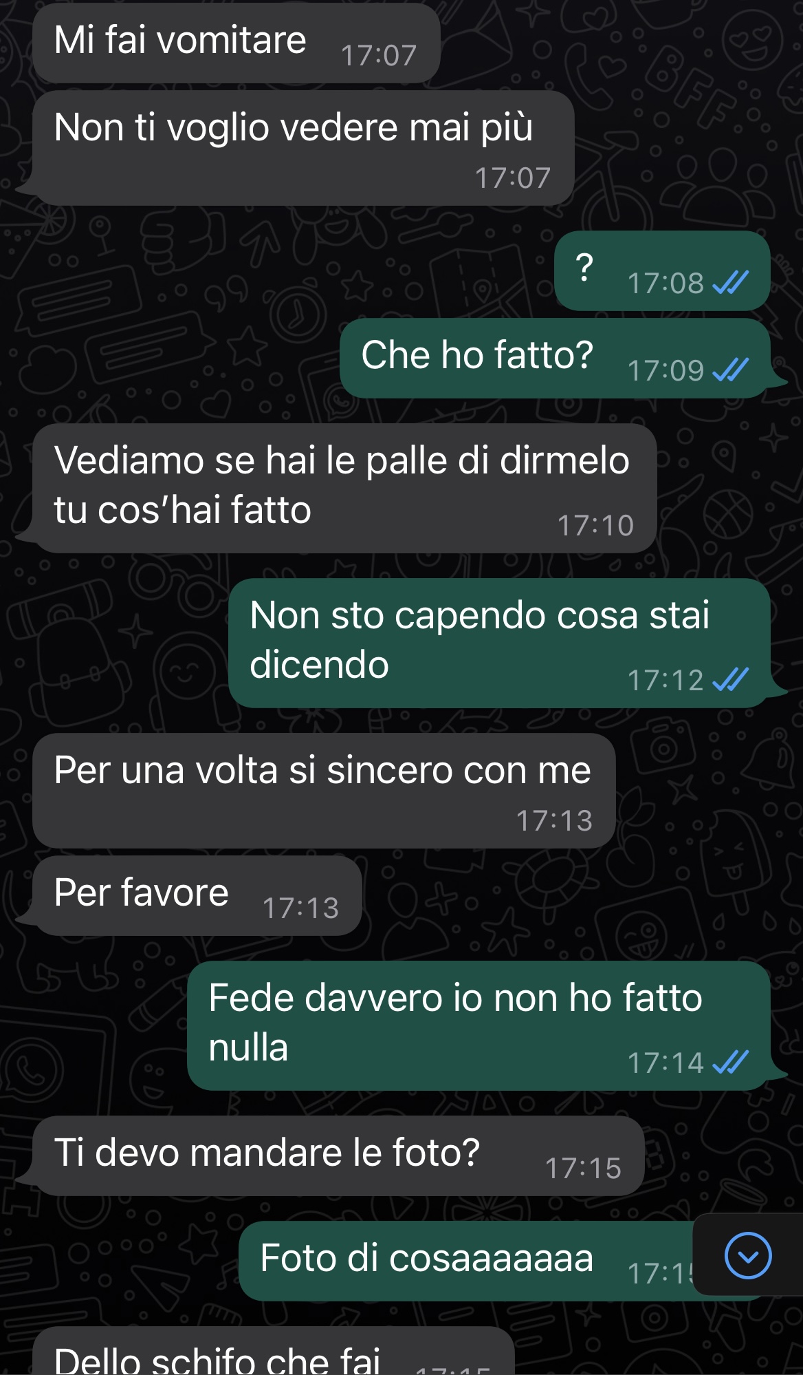 “Ciao ragazzi, io sono Luca. Ho 27 anni e da 6 sto con Federica che ne ha 23. Gli screenshot sono di qualche settimana fa e volevo inviarveli per farvi fare due risate anche se io non ho assolutamente riso quando è successo quello che leggerete.