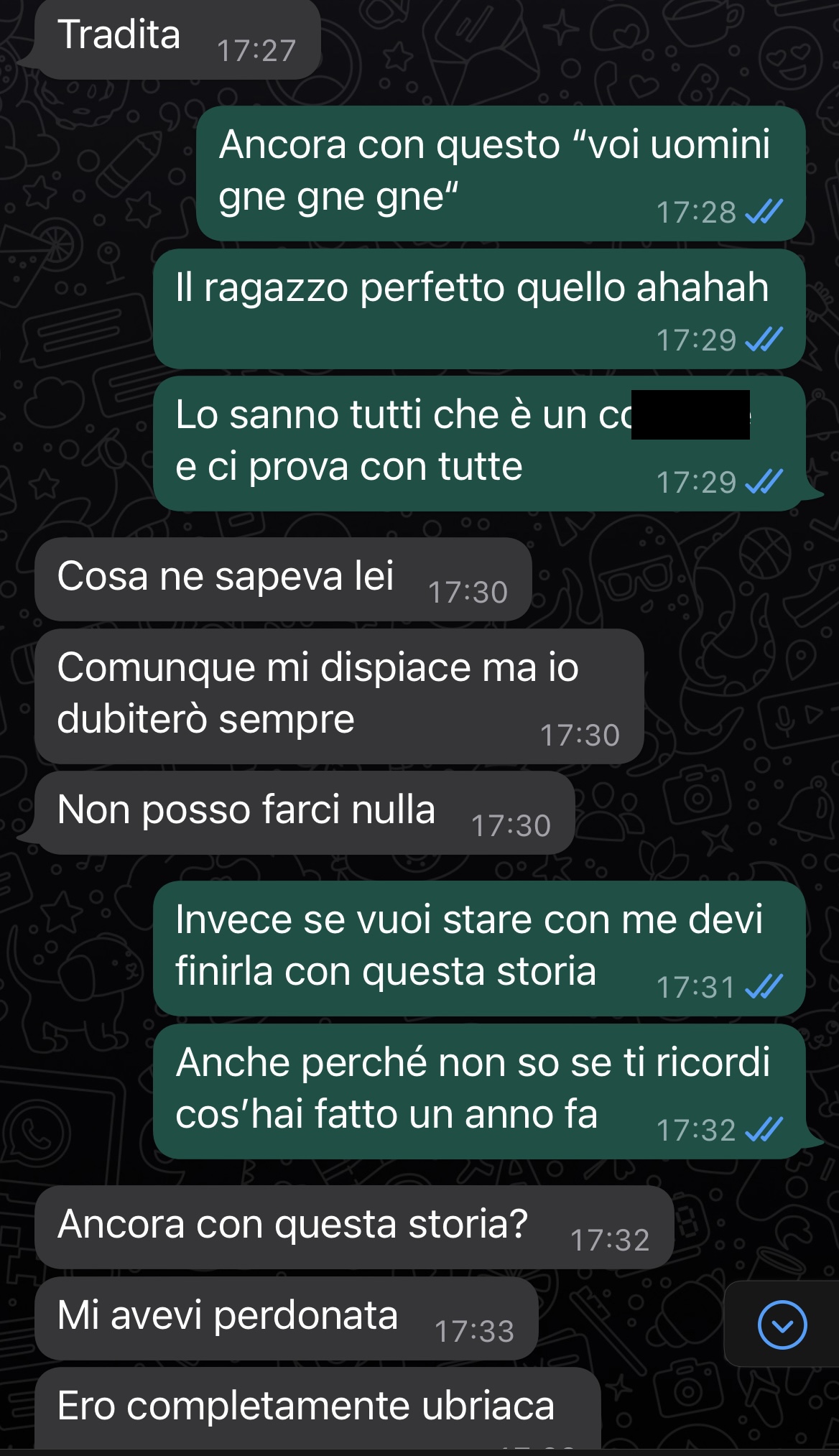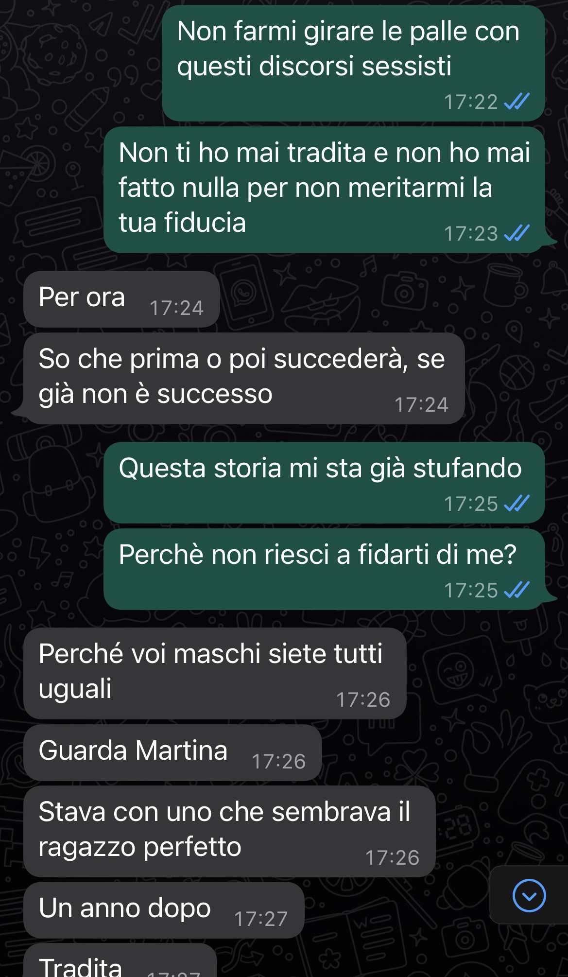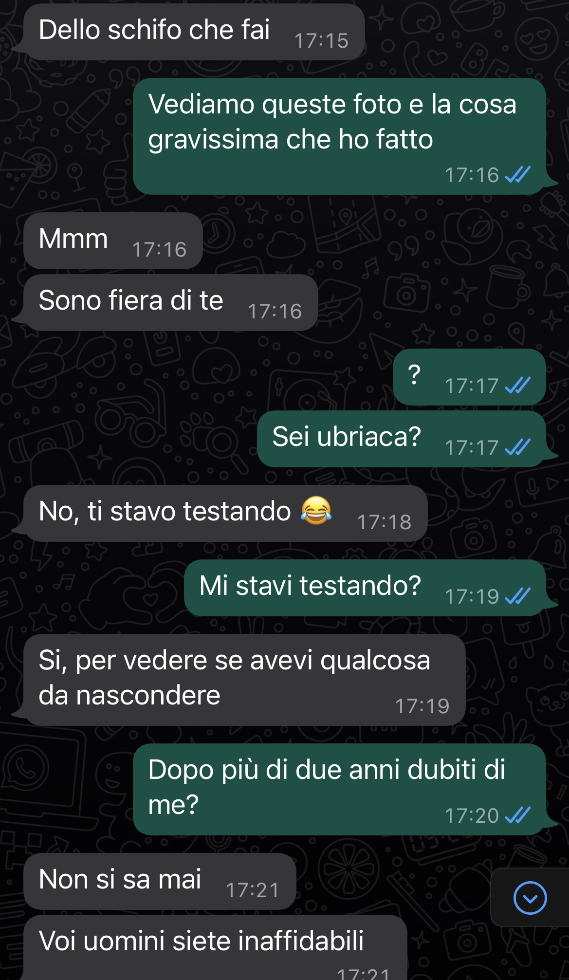 Ho cercato di dirle più volte che questo comportamento non faceva altro che allontanarmi da lei e farmi irritare ma non mi ha mai dato retta. Dava sempre le stesse risposte: noi uomini siamo sempre inaffidabili e tradiamo con molta facilità anche se siamo innamorati perché non siamo capaci di trattenerci.