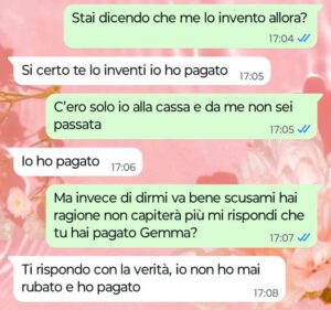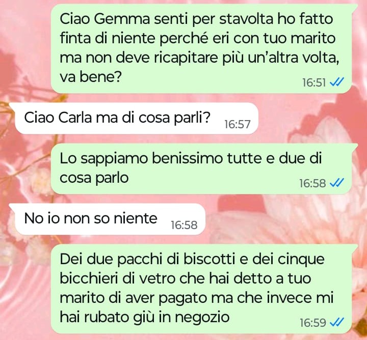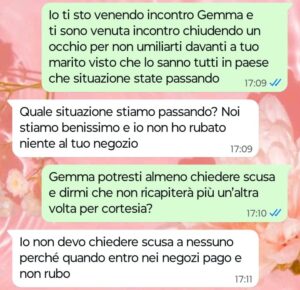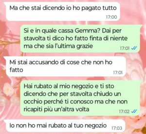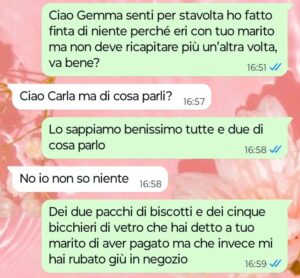 “Ciao Spunte Blu, sono proprietaria di un negozio di alimentari e prodotti per la casa in un piccolo paese in provincia di Roma di cui preferisco non fare il nome per una questione di discrezione. Io amo il mio lavoro e sono sempre stata una commerciante al servizio della mia clientela fatta di persone che stimo e con cui ho una certa confidenza visto che parliamo di un piccolo centro in cui ci conosciamo quasi tutti. Conoscendoci tutti bene, come in ogni paese tipico ognuno sa anche i fatti degli altri e le situazioni che attraversano certe famiglie sono molto spesso sotto gli occhi di tutti. Nel nostro paese purtroppo ci sono un paio di famiglie rovinate dai debiti per colpa dei mariti con il vizio del gioco e oggi in negozio mi è successa una cosa con la moglie di uno di questi mariti. Ora io ho fatto finta di niente ma ho avvertito questa donna che il fatto non deve ripetersi più visto che non è la prima volta che capita, ma leggete come ha risposto lei ai miei messaggi più che gentili e comprensivi della sua situazione personale. Questo è quello che si riceve ad essere buoni verso il prossimo, ma ora dico basta perché non ne posso più.”