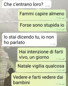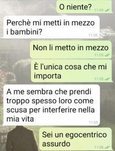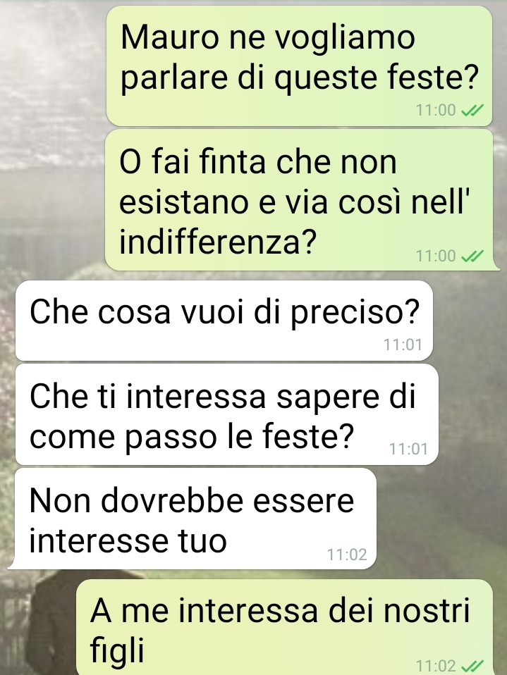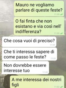 “Io sono una madre di 2 bambini di 8 e 4 anni. Quello che è stato mio marito mi ha lasciato circa 6 mesi fa. Per dovere di cronaca vi dico le circostanze di come è avvenuta la cosa anche se non è quello il nodo cruciale della questione e della chat. Mi ha lasciato per un’altra donna. Una donna divorziata con 2 figli, anche loro non arrivano ai 10 anni. E lo ha fatto dopo aver avuto una relazione clandestina con questa donna per 2 anni. Esatto, per 2 anni ha portato avanti una doppia vita. Ma lei sapeva che fosse sposato. Io mai sospettato che fossi cornuta. Me lo ha detto candidamente ed finita, strascichi legali e tutto il carrozzone. Quello che mi indigna e che davvero mi fa incazzare ancora adesso però è la totale indifferenza verso i nostri figli. Li ha cancellati con la stessa flemma con cui ha cancellato me. Gli ho scritto per capire se per le feste avesse una minima intenzione di stare coi bambini. Quello che ho ricavato lo trovate negli screen. Come si può essere così?”