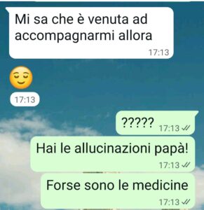 Mio padre aveva cominciato a vedere mamma. Questo cosa significava?? Significava che stava per morire anche lui?? O erano le medicine?? Gli antidolorifici forse possono fare scherzi del genere??