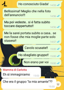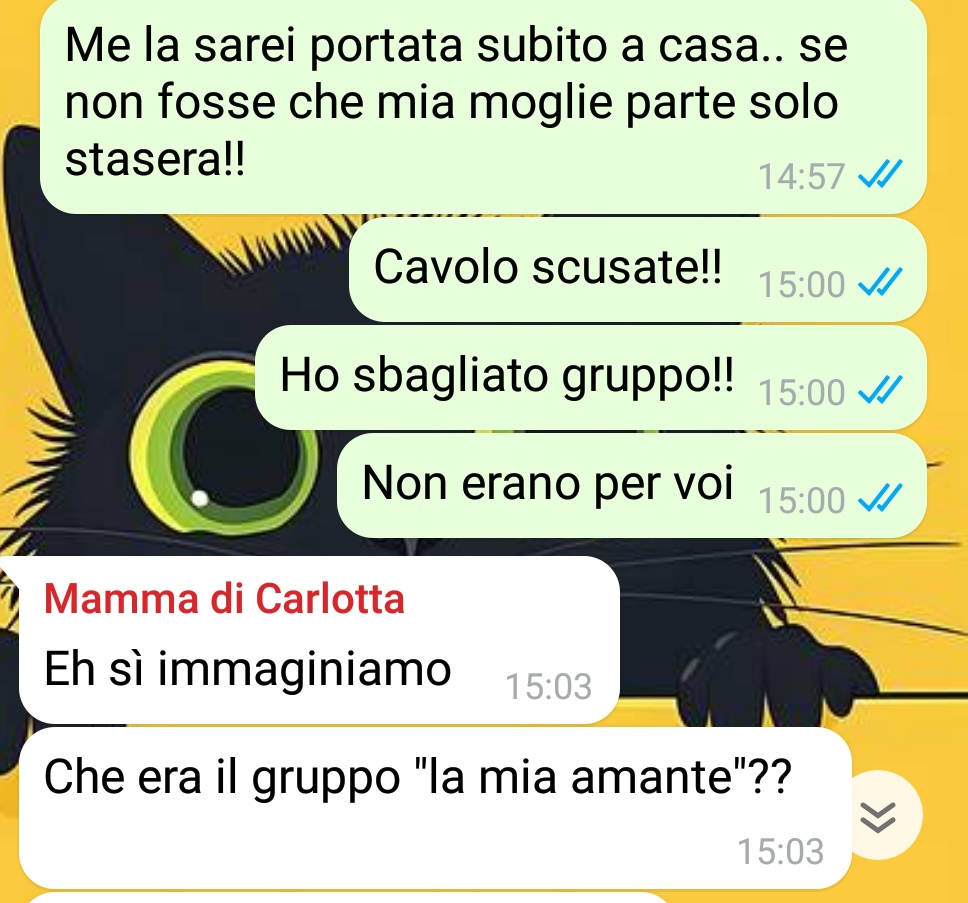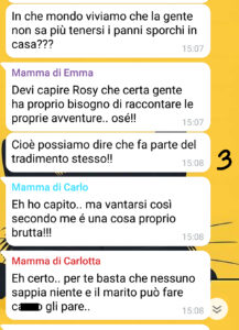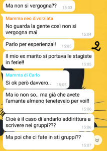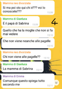 Quindi ad esempio lei cucina mentre io pulisco e faccio la spesa.. ma soprattutto sono io che mi occupo della scuola di Sabrina, cioè di tutte quelle piccole incombenze come recite, uscite, compiti e cose da comperare.. ma soprattutto la gestione della chat di classe!! Mia moglie odia queste cose e io, ingenuamente, mi sono proposto di occuparmene soprattutto perché non credevo che fosse una cosa così assurda, popolata da gente così malata di mente!! All’inizio davvero pensavo che non sarebbe poi stato così terrificante, poi, dopo il primo litigio furioso per una matita persa scoppiato in classe e tirato avanti per settimane sulla chat, mi sono ricreduto. Certa gente non sta bene. Inoltre essere l’unico papà non divorziato sulla chat non aiuta.. se poi si è distratti e si manda una commento nella chat sbagliata.. leggete..”