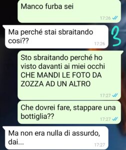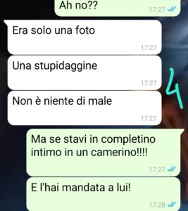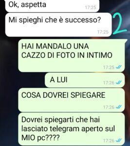 “Non so se vi è mai capitato quel momento in cui senti letteralmente il sangue che ti sale alle orecchie, come quando ti rendi conto che qualcosa non torna e non puoi più far finta di niente. Io stavo al pc, tranquillo, dovevo solo aprire un file. Telegram era già loggato perché lei l’aveva usato qui l’altro giorno e non avevo nemmeno fatto caso alla cosa. A un certo punto vedo spuntare una foto in diretta, una sua foto, in intimo, allo specchio di un camerino. Ci ho messo mezzo secondo a capire che non doveva comparire lì. E il mezzo secondo dopo è arrivato il messaggio di lui: “sei bellissima come sempre”. “Come sempre”. È quella frase che mi ha devastato più dell’immagine. Perché una foto puoi anche sbagliarti a mandarla. Ma “come sempre”? Vuol dire che succede spesso. Vuol dire che non era un incidente. Vuol dire che io ero l’ultima persona a sapere cosa stava combinando. E la cosa peggiore? È stata la calma con cui lei ha provato a farmi passare per quello esagerato.