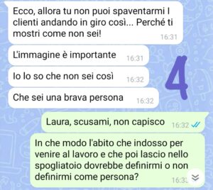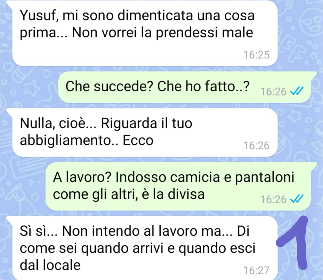 Qualche giorno fa la mia titolare mi chiama in disparte per parlarmi, mi riprende su alcune piccole cose, io ascolto e prometto di migliorare. Ma sono cose davvero minime e ho la sensazione che quello che vuole dirmi davvero non me lo stia dicendo. Il mio turno finisce, esco dal locale e poco dopo ricevo un suo messaggio. Della mia titolare intendo. Avevo capito bene, doveva ancora dirmi qualcosa ma non sapeva da dove cominciare…