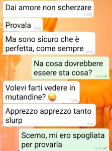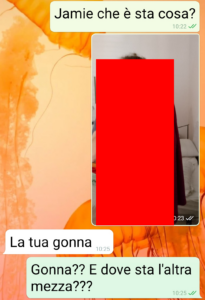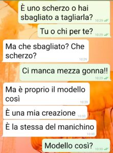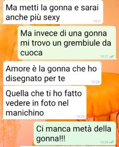 Ciao a tutti, io sono Chiara e sono fidanzata con Jamie da 4 anni. È un sarto bravissimo di abiti maschili, ma da un paio di anni si è messo in testa di essere uno stilista. Ha fatto dei cambiamenti nel suo business (ecco che Giovanni non è cool…), ha fatto marketing e osato con certi abiti e sponsorizzazioni, e devo dire che la cosa rende. Io sono sempre stata privilegiata da questa cosa, mi ha fatto tanti regali esclusivi. Ovvero abiti o gonne o giacche creati da lui e realizzati appositamente. Non mi posso davvero lamentare, ma questa volta… Aveva deciso di farmi una gonna lunga, e come ormai da tradizione mi ha anticipato un po’ di cose, con tanto di foto ecc. Mi ha consegnato la scatola ieri sera e stamattina la sorpresa. Per lui è alta moda, per me una mezza gonna. Si è ispirato alla moglie di Kanye West. E io dovrei indossare quella cosa? Negli screen la conversazione”
