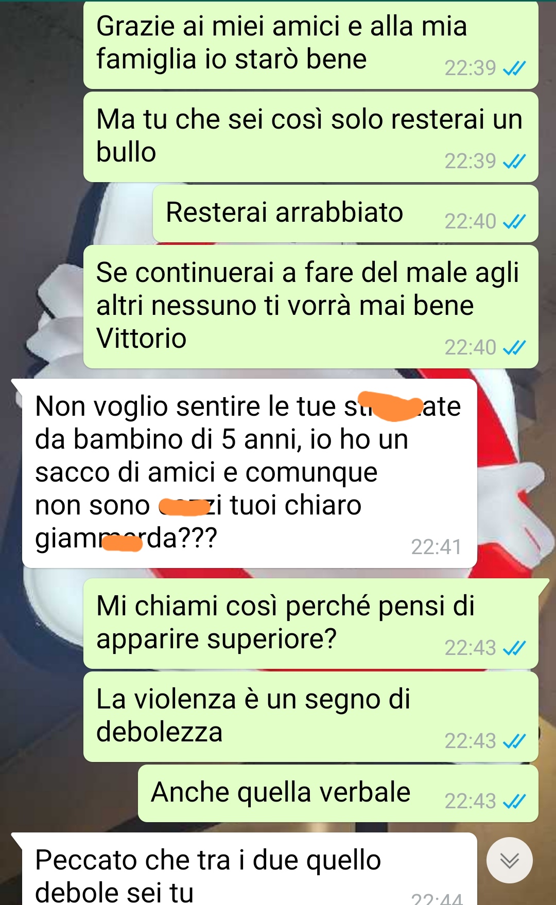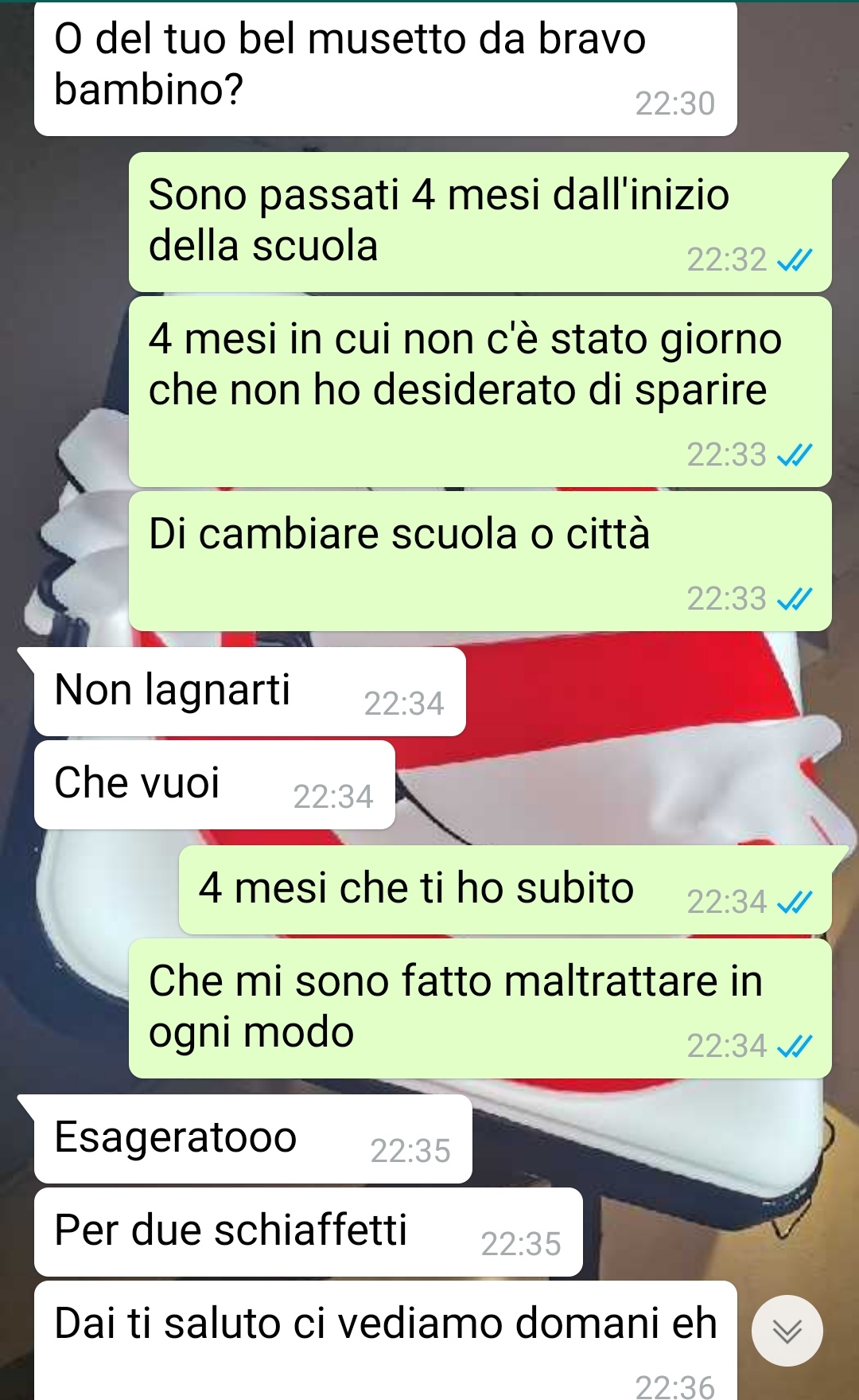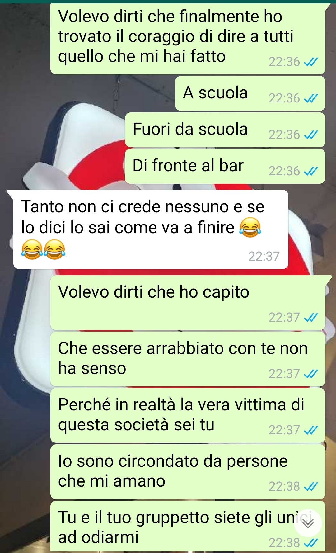 Ho scoperto un mondo quando ho confessato tutto ai miei genitori e adesso se penso al tempo passato a soffrire mi sento di aver perso mesi e mesi a fare brutti pensieri e isolarmi da tutti. Non è colpa mia, questo è vero. Ma non bisogna mai dimenticarsi dei propri affetti. Ragazzi abbiate il coraggio di parlare dei vostri problemi!!”