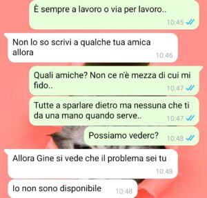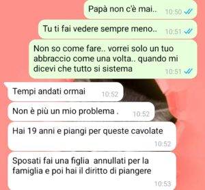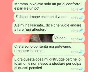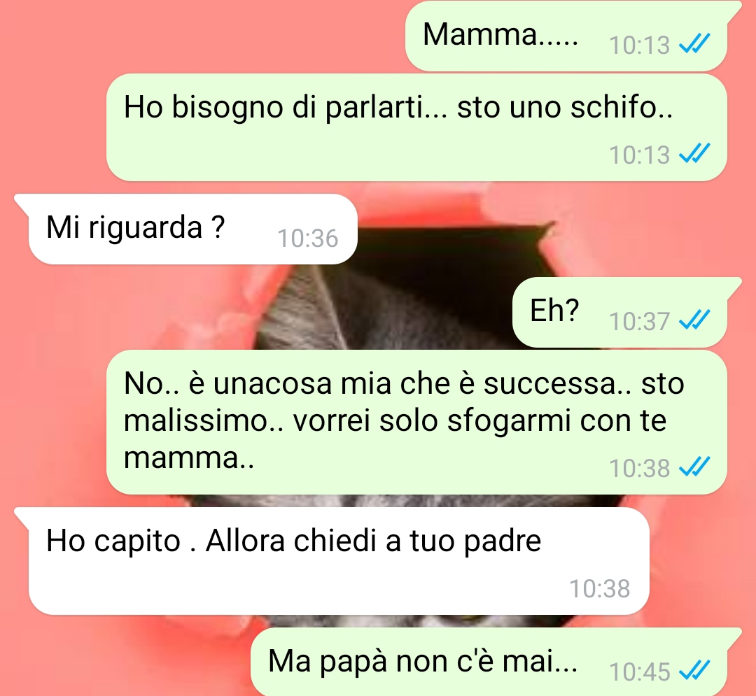 “Ho 19 anni, mi chiamo Ginevra e quest’anno devo fare la maturità, ma l’unica cosa a cui riesco a pensare è che la mia vita sta andando a rotoli.. Ho bisogno di mia mamma, di confidarmi con lei, perché da quando i miei genitori hanno divorziato, e questo è uno dei motivi che la mia vita si sta trasformando in un disastro, non ho più nessuno con cui parlare.. I miei si sono lasciati definitivamente alla fine dell’anno scorso, per me è stata una tragedia. Io vivo con papà e da quando mamma se ne è andata all’inizio la vedevo spesso, doveva prendersi le sue cose e cose così, poi piano piano si è dileguata sempre più. Ho iniziato a vederla sempre meno e ho immaginato che qualcosa in lei fosse cambiato.. Però ora, in questo preciso momento io avevo bisogno di lei, di mia madre, e lei ha deciso di comportarsi da vera s****a senza motivo. Voi la capite una donna che si comporta così? Io no… Sono completamente da sola, senza amiche VERE, senza un ragazzo, senza genitori su cui contare… O quasi. Ciao a tutti e in bocca al lupo per la maturità “colleghi”.”