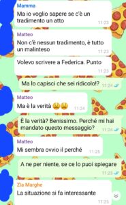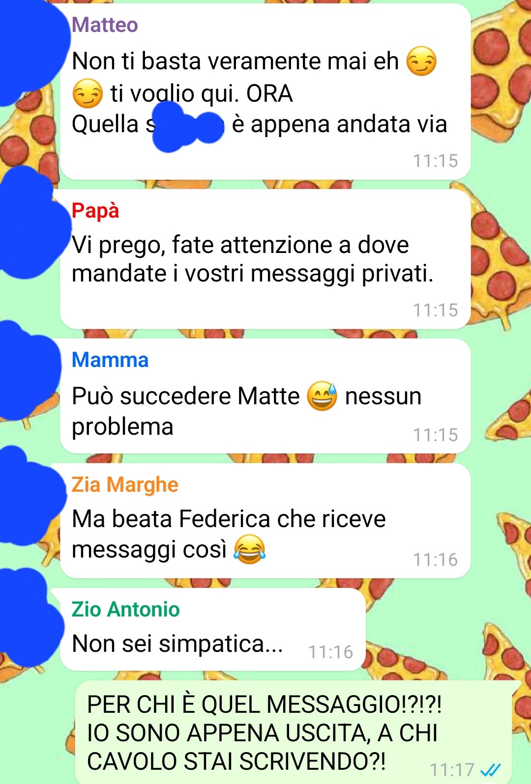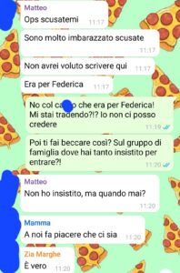 “Più volte ho letto di persone che hanno inserito i rispettivi fidanzati nei propri gruppi whatsapp di famiglia. All’inizio pensavo che non avesse senso, che fosse una forzatura, ma poi, non so come, siamo arrivati a quel punto. Un giorno, in presenza dei miei, il mio ragazzo, Matteo, mi chiede di inserirlo, e lo fa in presenza dei miei. Potevo dirgli di no? No…e allora è entrato. Niente di grave. Per più di tre mesi non ha scritto quasi nulla, faceva gli auguri alle varie feste, compleanni e onomastici, dava la sua disponibilità per eventuali cene ecc. e poco di più. E infatti avevo smesso di pensarci. L’altra mattina, però, è successo il fattaccio. Ero a casa sua, me ne vado, e pochi minuti dopo, casualmente con tutti i miei famigliari online, manda un messaggio sul gruppo. Un messaggio molto imbarazzante e palesemente non indirizzato a quella chat. Il vero problema però non è tanto la figuraccia imbarazzante, perché è successo a tutti quello. Il problema è il contenuto del messaggio e soprattutto il destinatario di esso. Ero furibonda…non ci volevo credere…”