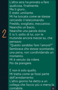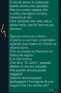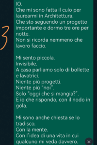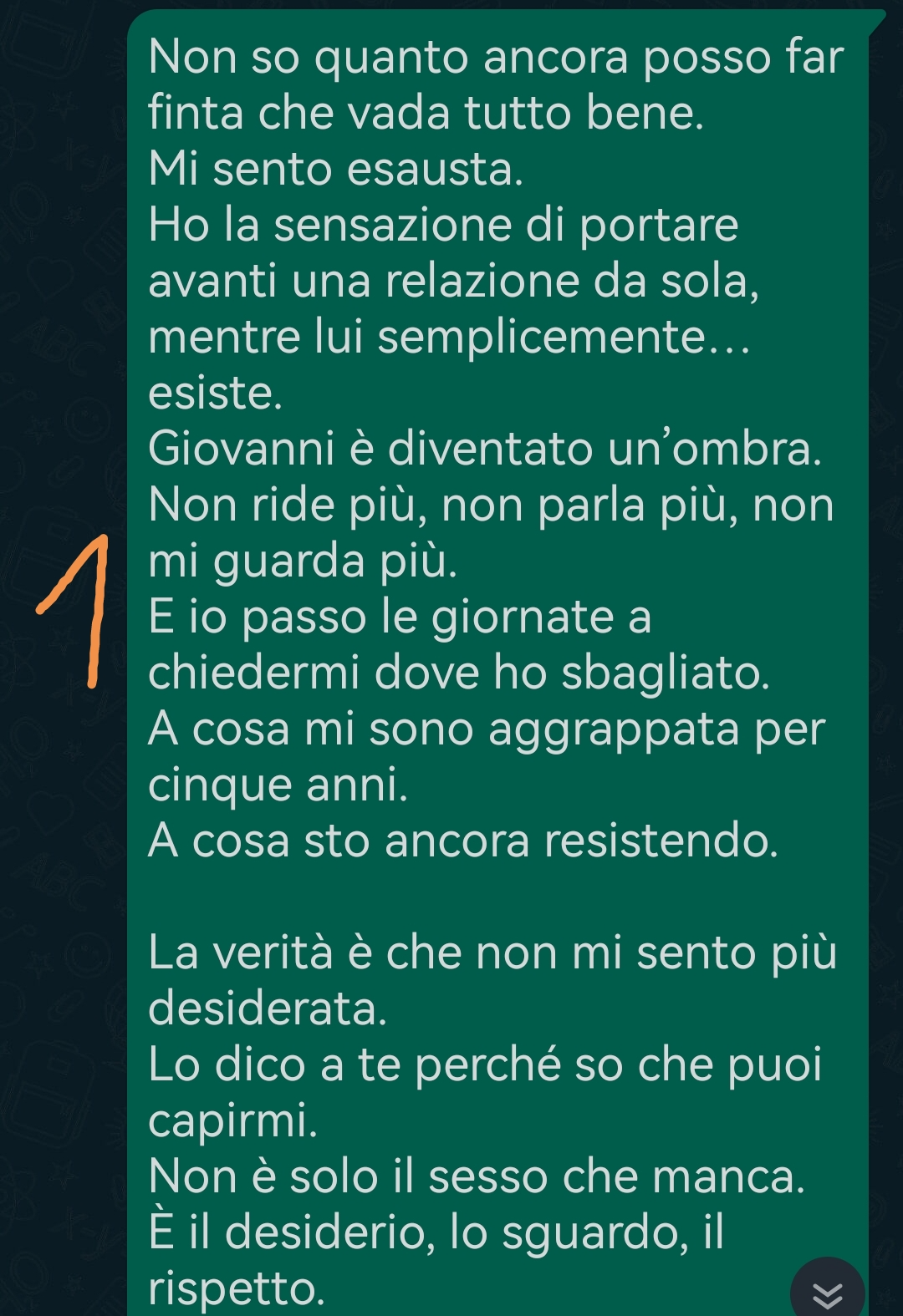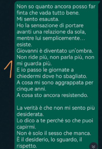 Dentro quel messaggio c’era di tutto. Ma proprio tutto: la frustrazione, la rabbia, i dubbi, persino dettagli intimi che non avrei MAI voluto condividere con una donna- magnifica – di quasi 55 anni che, tra l’altro, pensa ancora che io e Giovanni siamo “una bellissima coppia”. Spoiler: non lo siamo più da un po’.