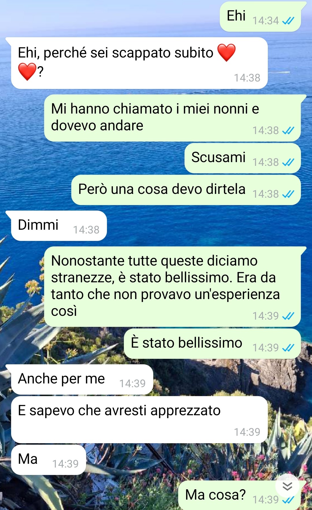 “Non saprei dire se ero sono stato coraggioso o semplicemente incosciente. Quando mi ha mandato quella prima lista di regole, l’ho letta tre volte pensando che stesse scherzando. Come avete letto, non volevo crederci, mi sembrava assurdo. Poi però ho accettato e mi sono presentato da lei. E soprattutto l’ho vista: capelli sciolti, occhi che ti inchiodano, un misto di dolcezza e determinazione che non ammetteva repliche. Ho accettato. Non per convinzione, ma perché era lei, e con lei anche l’assurdo sembra avere un senso. E così è andata. Strano, certo. Diverso da come me l’ero immaginato, ma… devo ammettere che alla fine è stato bello. Molto molto bello. Forse non per il “come”, ma per il fatto che era con lei. Eppure, mentre restavamo lì, con il respiro ancora irregolare, lei mi ha detto: “Dopo ti devo rivelare una cosa importante.” Volevo che me la dicesse subito ma ho avuto un imprevisto e sono dovuto scappare. Così, poco dopo, mi ha scritto, e mi ha finalmente detto tutto. E quello si che è davvero stato l’inizio della fine…”