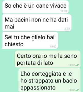 mia madre ha una cagnolina davvero carina, piccola e affettuosa, che ogni volta che mi vede mi fa le feste, mi salta di sopra, scodinzola. l’altro giorno la cagnolina ha avuto l’ardire di darmi delle leccatine in viso. a me non fa piacere s’intenda, anzi. ma mi ha colto di sorpresa e mia madre rideva. col cellulare in mano è riuscita a scattarmi una foto di quel momento, foto che poi ha condiviso prontamente in una storia. Ho chiesto a mia madre di coprire il mio volto perché mi imbarazzava che tutte le sue amiche mi vedessero mentre il cane mi leccava il viso.