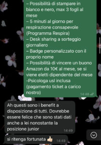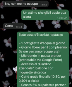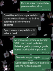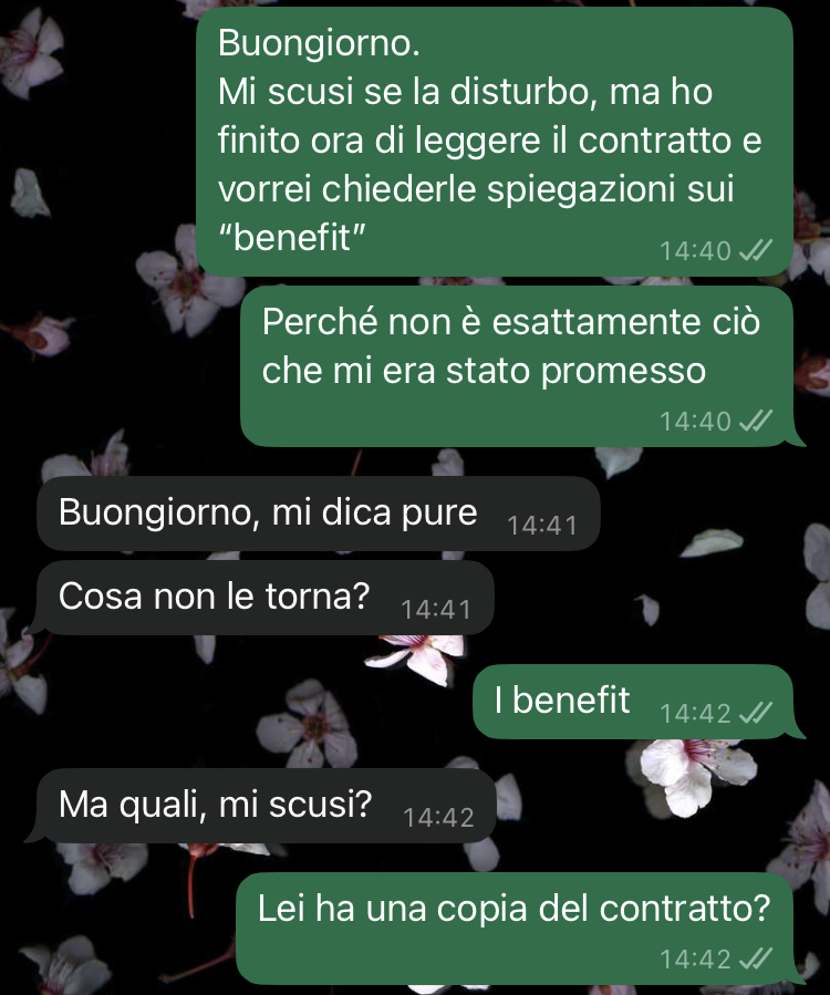Dopo settimane di colloqui, promesse, frasi motivazionali e parole altisonanti, mi sono ritrovata davanti a un contratto che mi ha fatto venire più domande che certezze. Ho deciso di chiedere chiarimenti, semplicemente. E da lì… be’, lascio parlare i messaggi.