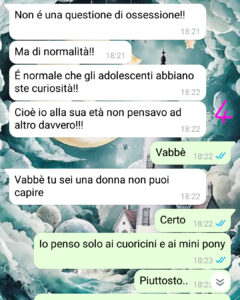 Battute a parte, io mi rendo conto benissimo che i miei figli ormai sono quasi adulti, tra poco maggiorenni.. mio marito invece ha una visione della realtà particolare: lui vede Jacopo che cresce e riconosce che sia ormai grande eccetera.. ma lo stesso discorso non riesce a farlo per nostra figlia Matilde, anche se lei ha la stessa età! Di fatto per lui Matilde è sempre la bambina con le trecce che vuole giocare a pallone, non riesce completamente ad accettare che sia diventata grande, che presto sarà una donna a tutti gli effetti! E francamente c’è anche il fatto che lui non capisce che uomini e donne non sono poi così diversi..