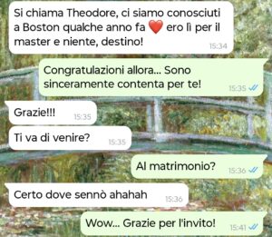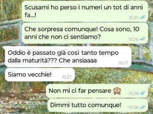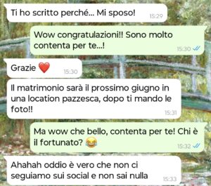 Arriviamo a 10 anni dopo, cioè a settimana scorsa, quando mi scrive per invitarmi al suo matrimonio. Dal nulla. Io rimango spiazzata ovviamente perché, cioè, ormai chi ti conosce più no? Non sapevo nemmeno cosa dirle oltre congratulazioni e sono contenta per te!