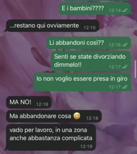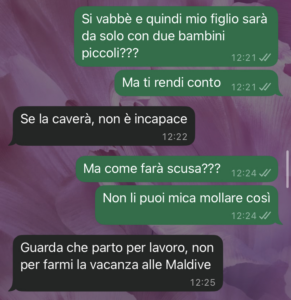 Io non capisco se sono io esagerata o se qui c’è qualcosa che non va sul serio. Perché per me certe cose hanno un peso, non si possono prendere alla leggera. Non capisco queste donne moderne che vogliono fare le emancipate e si dimenticano dei figli e del marito in questo modo, è inaccettabile!! Ci sono dei ruoli da rispettare!