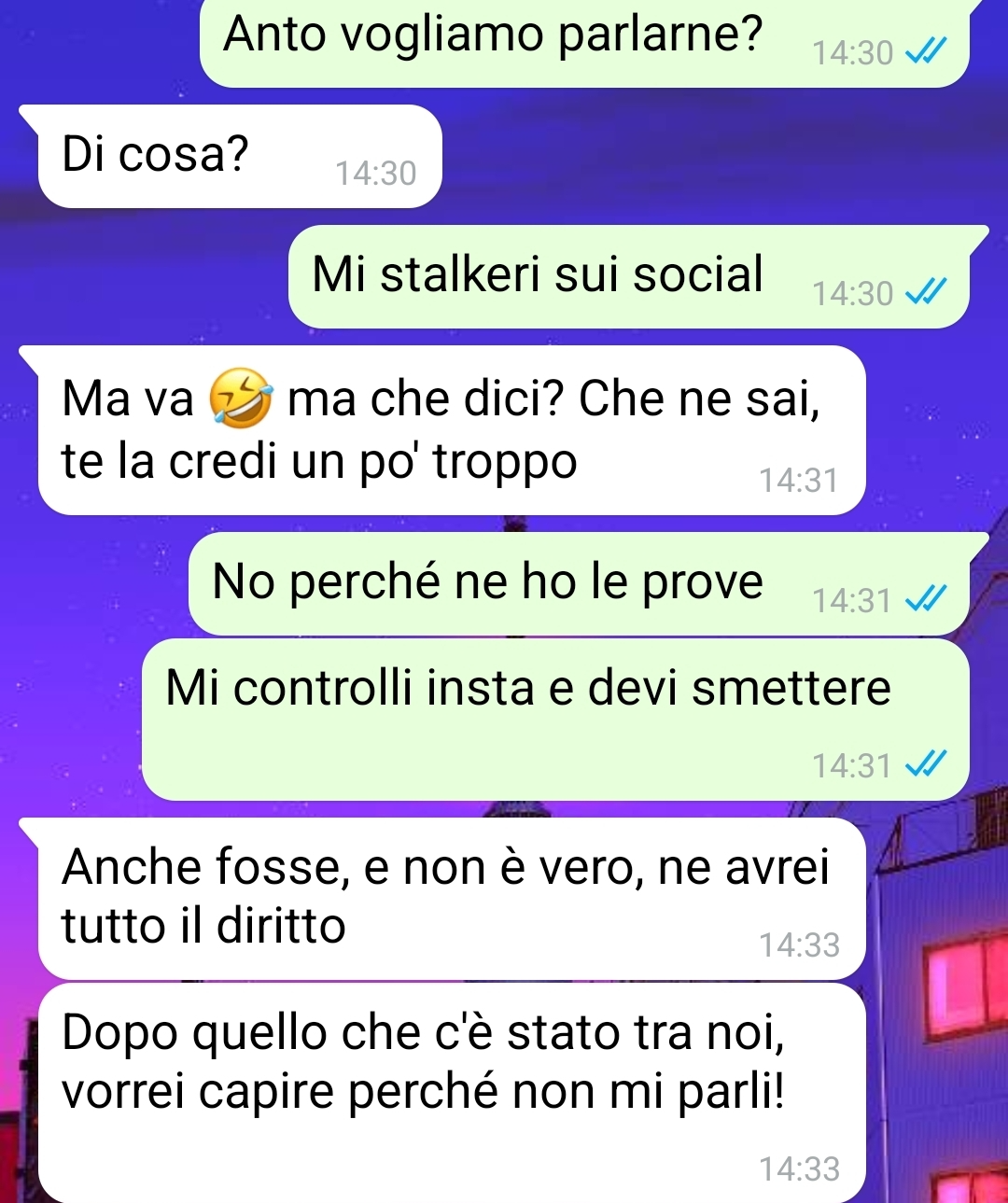 “Buongiorno cari amici di Spunteblu, mi ritrovo a farvi leggere una cosa che mi è successa con una persona che non mi aspettavo si sarebbe comportata così. Il mio nome è Alessandra, ho 23 anni e vivo una situazione complicata perché studio in un’altra città, vivo in una casa che posso permettermi a malapena e ogni tot devo chiedere aiuto ai miei genitori perché da sola non riesco e questa cosa mi fa imbarazzare davvero tantissimo, ma non mettiamo in conto che la situazione dai miei è anche peggio per tutta una serie di cose che non starò qui a raccontarvi. Il fulcro della questione è un altro. È Antonio. Con lui c’è stato qualcosa in passato, non ci parliamo più da un poco di settimane, saranno un paio ormai, e anche se mi manca, quello che ha fatto non so se posso perdonarlo. Vorrei solo andare avanti, se non fosse che ho scoperto che mi stalkera sui social, perciò ho pensato di poter affrontare una discussione tranquillamente e invece è diventata una guerra vera e propria.”