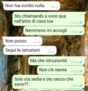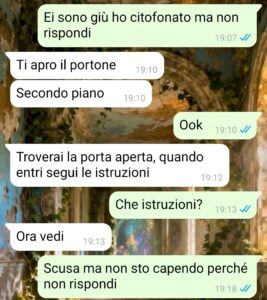 “Ciao a tutti, mi chiamo Alba e ho scansato il disastro, come si suol dire. Questo perché ho conosciuto una persona che si chiama Luca, uno di 34 anni che sembrava uno perbene, normale, che si comportava bene e non sembrava avere stranezze particolari. Io ho una tragica storia di relazioni con gente che aveva le peggio fisse. C’era quello fissato con i piedi, tremendamente sporchi.. e non i miei… C’era quello che si tagliava le unghie a tavola mentre si mangiava anche se c’erano ospiti e infine questo Luca. Io penso di essere condannata, che forse è l’inferno e sono destinata a trovare solo pazzi. Fatto sta che all’inizio mi trovavo bene, uscivamo e stavamo a divertirci, anche se lui non mangiava o beveva mai nulla e già sta cosa è strana, perché andiamo al bar e mi guarda mangiare, boh. Fatto sta che dopo un po’ che ci vediamo e ci sentiamo, lo convinco a farci una seratina a casa da soli e dato che io vivo con i miei e lui ha casa sua, sono andata da lui. Mi apre il portone, mi dice il piano e che avrei trovato la porta socchiusa e una volta entrata… ma non vi dico altro, vedrete!”