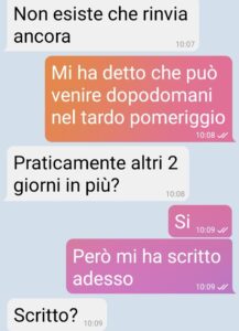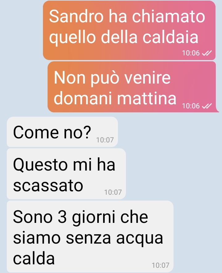 “Buongiorno. Me ne frego alla grande di smer***e mio marito ma quando ci vuole ci vuole. Non si può soprassedere su certe sparate. Siamo a gennaio e il freddo è allucinante. Quanto pensate si possa stare senza acqua calda? Si è infatti rotta la caldaia qualche giorno fa e il tecnico ha detto che poteva trovare il ricambio e ripararla dopo 3 giorni, che rischiavano di diventare 5 o 6 proprio oggi. Avete idea che significa avere l’acqua praticamente gelata sulle mani? Abbiamo il recipiente sul tetto, con fuori 6 gradi, per farvi capire. Ora sto tizio, forse per carità dato che mi ha dato buca per il giorno previsto, mi propone di anticipare a oggi, prima di pranzo. Fantastico mi dico. Ma non per quel essere di mio marito. Ma che ha nel cervello, segatura? Come faccio a trattenermi dallo sputargli in faccia quando torna? Non avrei dovuto avvisarlo proprio.”