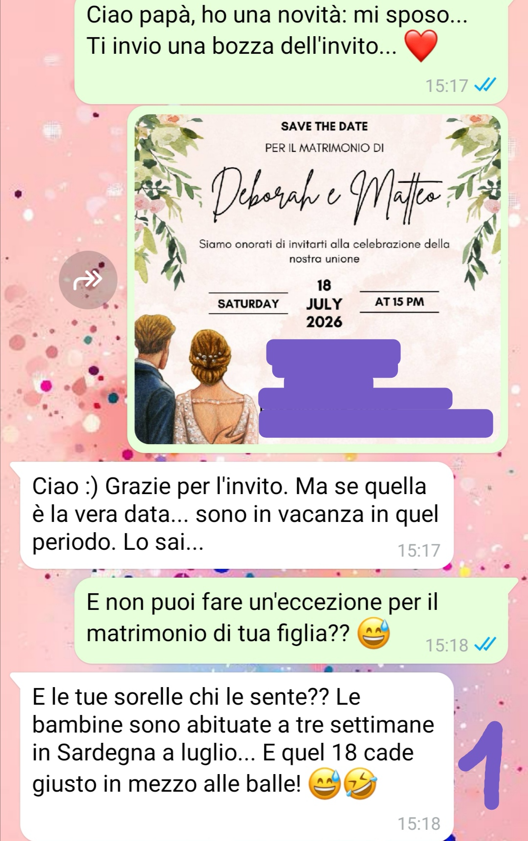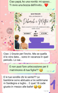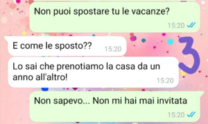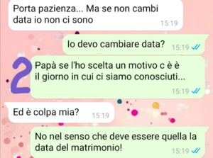 Come vi dicevo però quando ho comunicato la data, soprattutto a una persona in particolare…beh è successo quello che non mi sarei mai immaginata. E vi mando la chat perché purtroppo adesso a distanza di mesi da quella conversazione mi ritrovo impantanata…