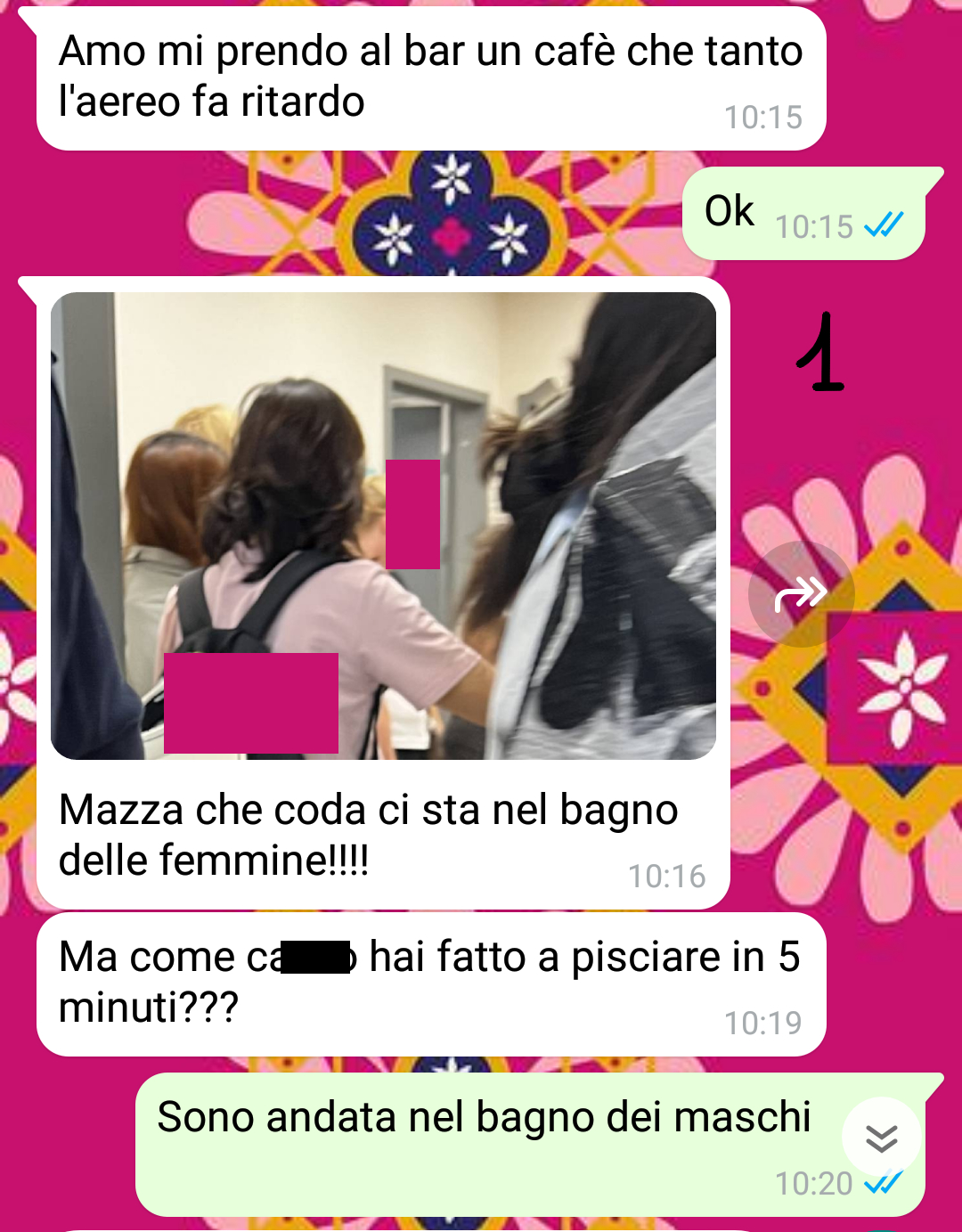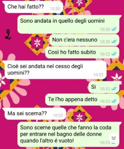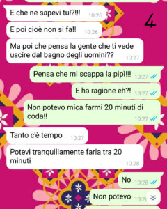 Devo dire che, primo impatto a parte, si sta adattando bene, ma gli resta un atteggiamento ancora molto provinciale che davvero a volte non sopporto.. ad esempio: l’ultimo viaggio che abbiamo fatto insieme qualche settimana fa si è concluso male! Tutto è stato causato da troppa acqua e da una fila infinita al bagno delle signore… leggete…”