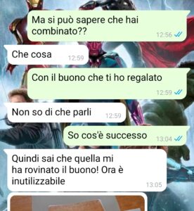 “Salve a tutti, allora come ci si organizza per mandare queste chat e queste righe di presentazione? Immagino dovendomi presentare. Beh, io sono Floriana, sono una ragazza di 30 anni e ancora ora mi stupisco di quanto le persone riescano non solo a essere immature, ma anche cattive. Solo che vi fermo subito e vi dico, magari deludendovi, che non parlerò di un ragazzo, un fidanzato, un traditore o cose del genere, ma di una mia amica, una tra le più care, che si è comportata in un modo che non reputavo possibile sinceramente. Io e lei, si chiama Lorena e ha la mia età, ci conosciamo da tantissimo tempo, almeno 3 anni, che per me è davvero tanto tempo. Lei pensavo fosse una persona corretta e dato che di recente ha fatto il compleanno e non avevo bene in mente cosa regalarle, dato che è una che di per sé ha già tutto, le ho voluto prendere una cosa particolare. Un buono sconto per un negozietto di un’altra persona che conosco, un’altra cara amica.