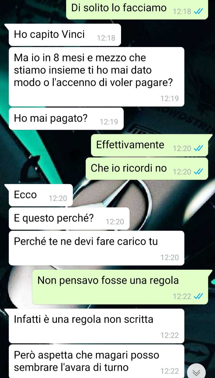Ora mi presento, sono Vincenzo e la ragazza della chat si chiama Daniela. Noi due stiamo insieme da 8 mesi e mezzo per l’esattezza. Cosa mi è successo? Praticamente ho attivato, se così si può dire, un’abitudine nella vita di Daniela e poi questa abitudine è venuta a mancare, senza volerlo, proprio il giorno in cui risale la conversazione, questi sono i messaggi e questo è quello che è successo.