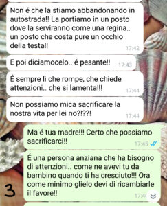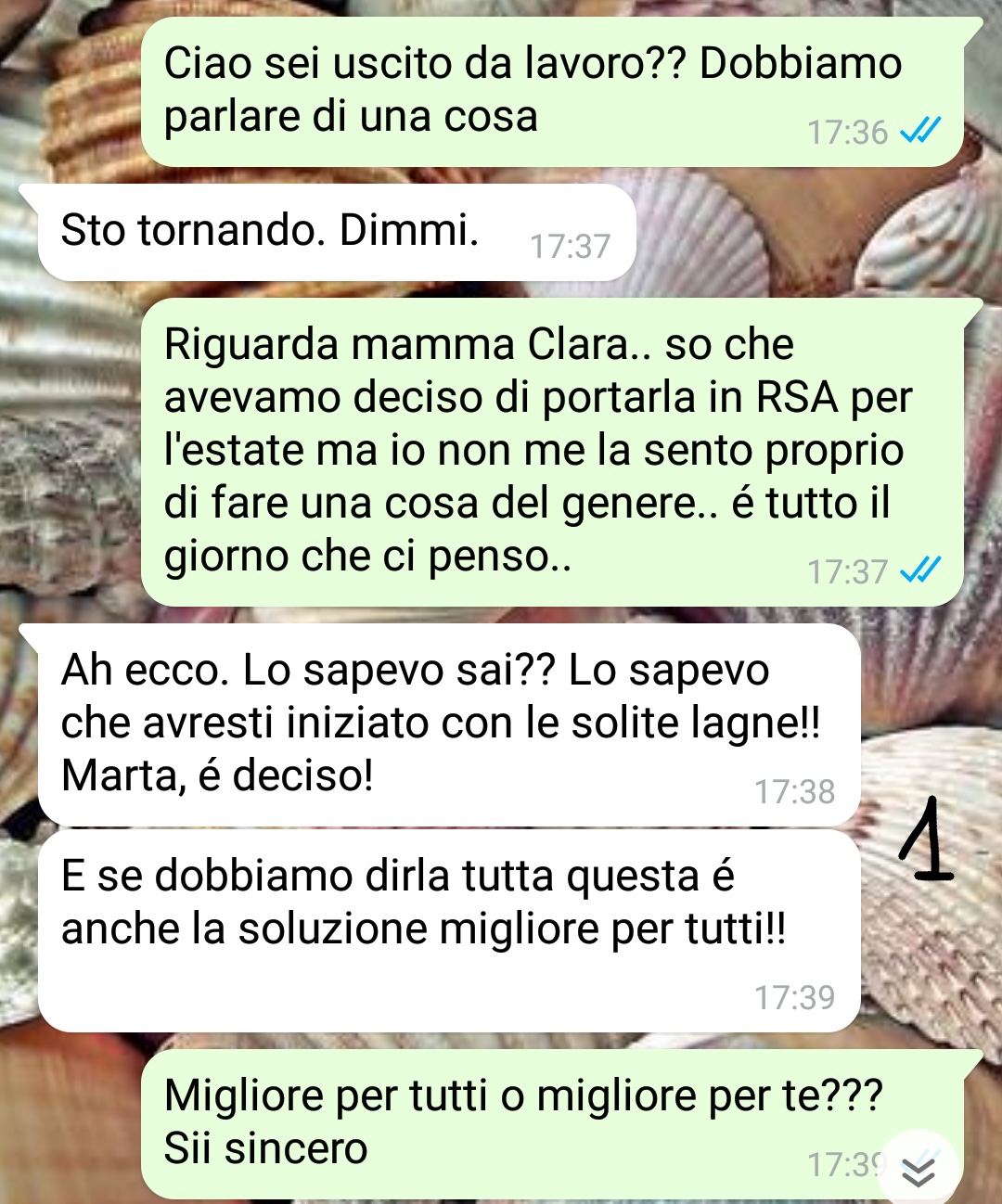 In ogni caso il malumore di Ernesto è aumentato con il tempo così io, per amore di pace, ho accettato di lasciare mamma Clara in RSA per le nostre vacanze estive, invece di alternarci come volevo fare inizialmente.. però poi mi è venuto il dubbio che questa soluzione fosse non del tutto temporanea per Ernesto..”