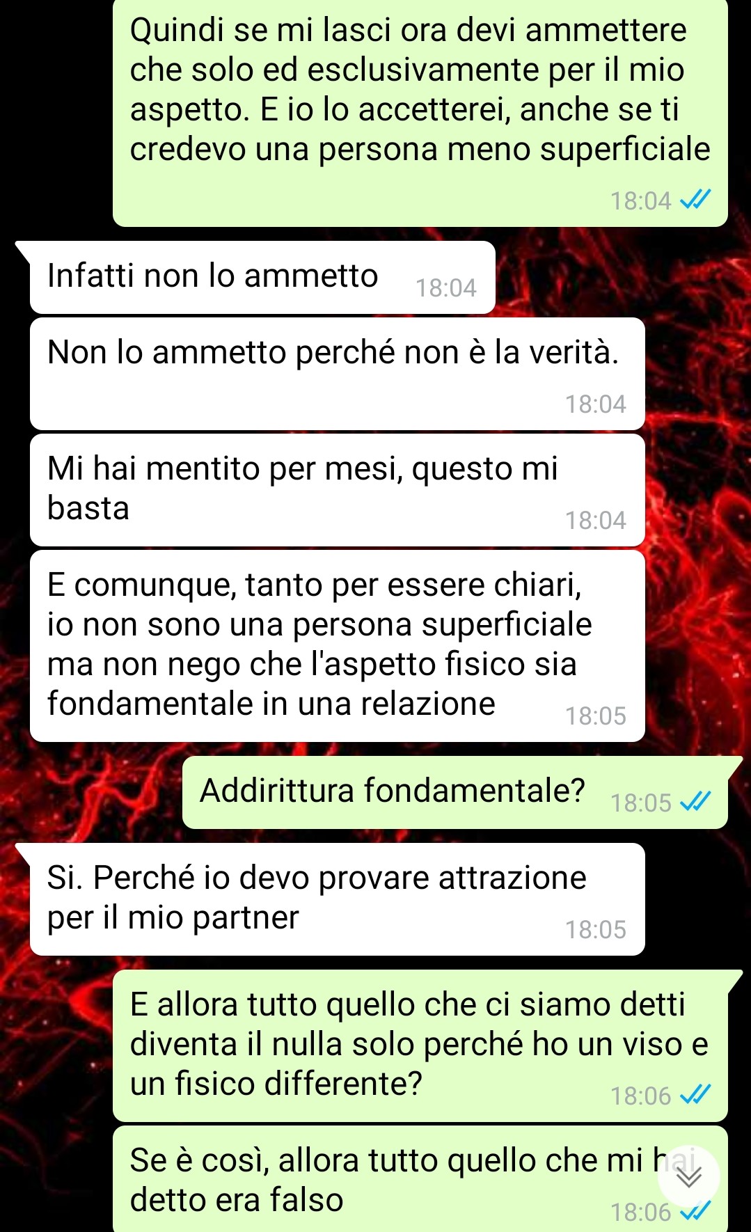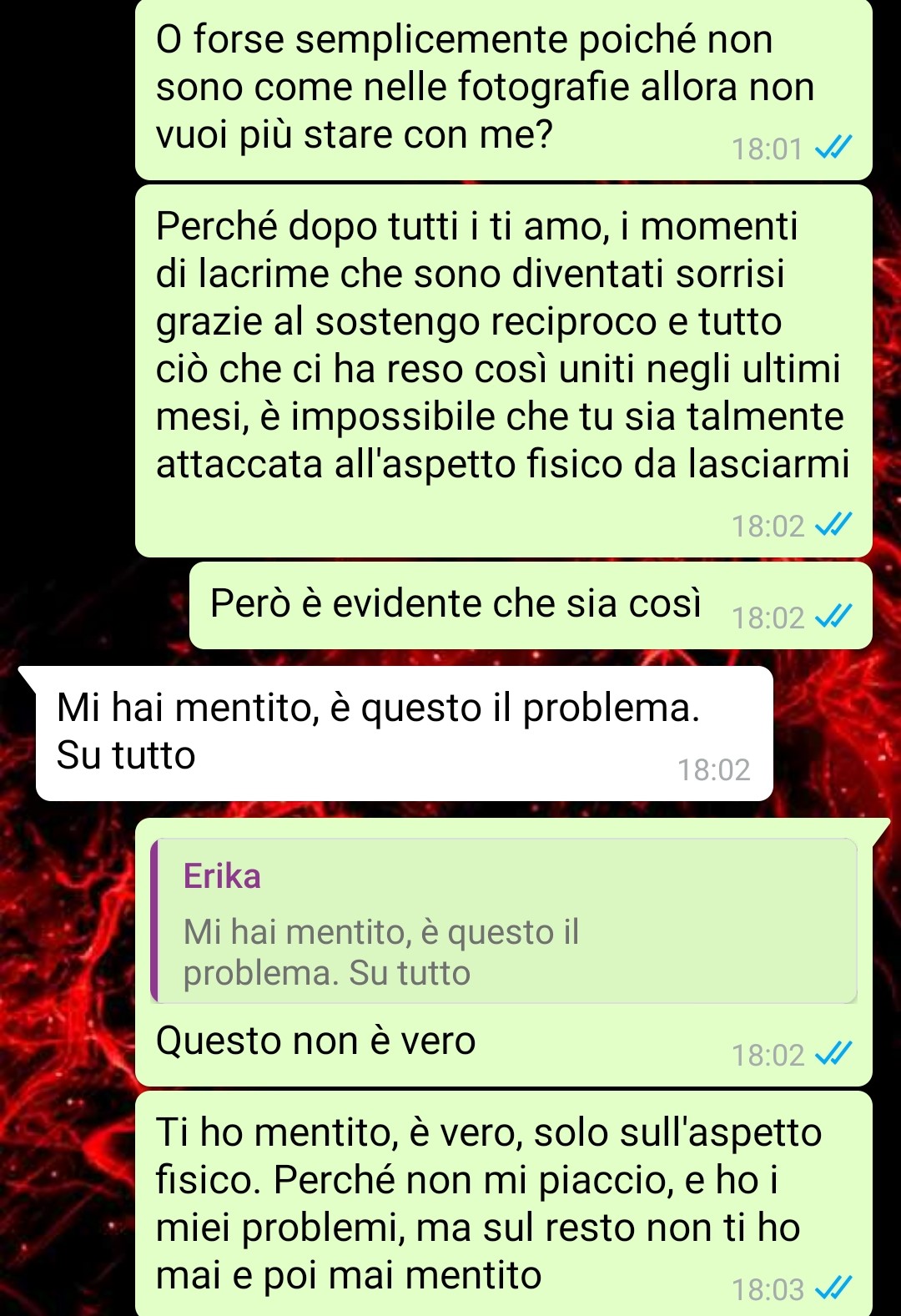 Dopo varie insistenze da parte sua (ma com’è giusto che sia) ci siamo visti di persona e lei ha capito che io non ero quello delle foto. Lo ammetto, perché non voglio dire il contrario: io ho sbagliato, su questo non ci sono dubbi, ma l’ho fatto in buona fede.