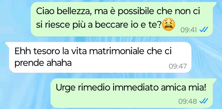 “Ciao Spunte Blu, mi chiamo Elisa e vi scrivo per raccontarvi e farvi leggere l’ennesima delusione che mi è capitato di ricevere da una delle mie amiche più care, un’amica che purtroppo da quando si è sposata (evento recente per lei, mentre io sono sposata già da un anno e mezzo) è sparita con tutti, me compresa. L’amica di cui vi parlo si chiama Angelica ed io e lei abbiamo sempre avuto un rapporto speciale, molto stretto fatto dei nostri appuntamenti e di piccole coccole che ogni tanto ci concedevamo insieme. Oggi scrivo ad Angelica che non vedo più in pratica da quando si è sposata per lanciarle un invito a vederci e con la scusa le ho proposto una cosa che facevamo spesso insieme quando lei non era sposata. Preparatevi a leggere la sua risposta alla mia proposta super normale e standard e resterete senza parole. E pensare che la conosco da sempre e non ha mai fatto ragionamenti di questo tipo in vita sua, o almeno non con me, tanto che c’è stato un attimo durante la nostra chat che ho creduto di stare a parlare con un’altra persona o che si trattasse di uno scherzo ma purtroppo no, è tutto reale. Proprio vero che non si smette mai di conoscere la gente. Leggete”