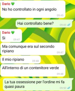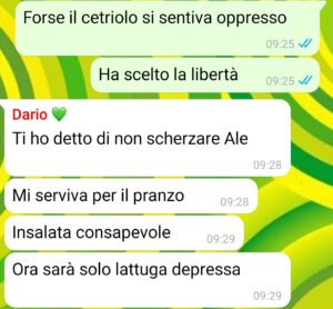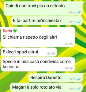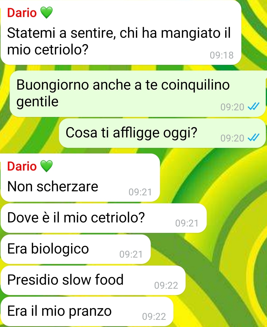 “Ciao Spunte Blu, io sono Alessio, attualmente vivo con Dario e Irene e gli screenshots che vi mando appartengono alla nostra chat di coinquilini. Viviamo insieme da un po’, ognuno con le sue abitudini, i suoi rituali alimentari e le sue piccole fissazioni. Finché va tutto liscio, sembra quasi facile. Poi però succede qualcosa di minuscolo, come quello che è successo nella chat che leggerete, e ti rendi conto di quanto sottile sia l’equilibrio che regge una convivenza. Questa conversazione è cominciata con una domanda innocente, che in realtà era un’accusa bella e buona, e da lì è partita una spirale surreale fatta di battute, sospetti, rivelazioni e momenti che vorresti solo dimenticare. Ma ormai era troppo tardi. Se avete mai diviso una casa con qualcuno, sapete benissimo che certe dinamiche nascono anche solo per una posata fuori posto. Qui, invece, tutto è iniziato da un ortaggio, e non un ortaggio qualsiasi. Ma fidatevi: non avete idea di dove si possa finire. Leggete gli screen. Non ve ne pentirete.”