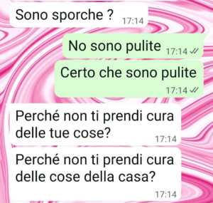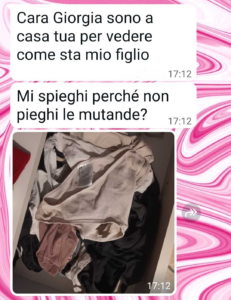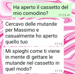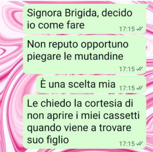 “Mia suocera è venuta a trovare suo figlio a casa nostra. Ha fatto il check di tutta la casa. Le mutandine io mi rifiuto di piegarle e c’è un motivo. Un motivo valido per cui io scelgo di non stirare le mutande, di non piegarle, di non fare il cambio stagione immediatamente. Ma mia suocera viene da un’epoca e da un contesto in cui tutto ciò che era richiesto a una donna era fare le pulizie di casa tutto il giorno, stirare lenzuola, mutande, strofinacci, stirare pure il mocio a che ci siamo, perché no?. Doveva fare questo e fare i figli, crescerli ed essere la loro serva soprattutto di quelli maschi, trattati come principi, senza che ce ne fosse nessun motivo. Mia suocera vive nella sua bolla felice, dove i ruoli sono netti, non c’è spazio per le sfumature. C’è una cosa che però non sa sul suo principino e mi dispiace ma me l’ha strappata di bocca. Massimo non voleva che lo dicessi a sua madre. Ma ho dovuto dirle come stanno le cose. Da lì il silenzio. Non mi ha più risposto fino a oggi. Credo di averle spezzato il cuore.”