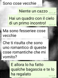 Ciao amici di spunte blu, sto aspettando che la pioggia cessi per tornare a casa, e allora ne approfitto per scrivervi due righe e mandarvi questi screen, che ho appena finito di sminuzzare tutto… sono anche un po’ stanca, oltre che arrabbiata, ma adesso soddisfatta. Il motivo è il seguente: Ero a casa del mio ragazzo, una bella villetta con giardino fuori città. Approfittavamo dell’assenza dei genitori, per goderci il weekend… avete capito. E mi viene un’emicrania assurda e un po’ di febbre. Forse il maltempo… Lui allora esce per andare in farmacia a prendere qualcosa. E per distrarmi dal dolore faccio un giro in casa, che fino ad ora avevo visto solo il salotto, coi suoi presenti. E non ti trovo questo quadro romantico del cielo del primo incontro? E secondo voi non è giusto chiedere spiegazioni? E non sono forse una signora nonostante tutto?”